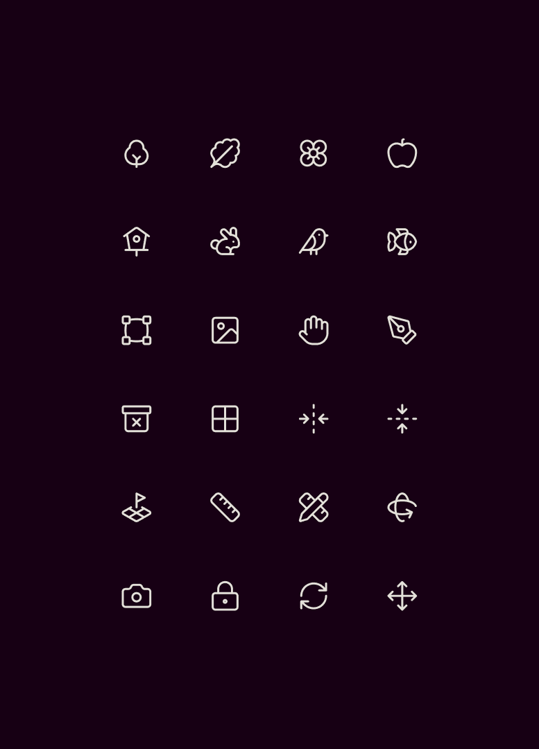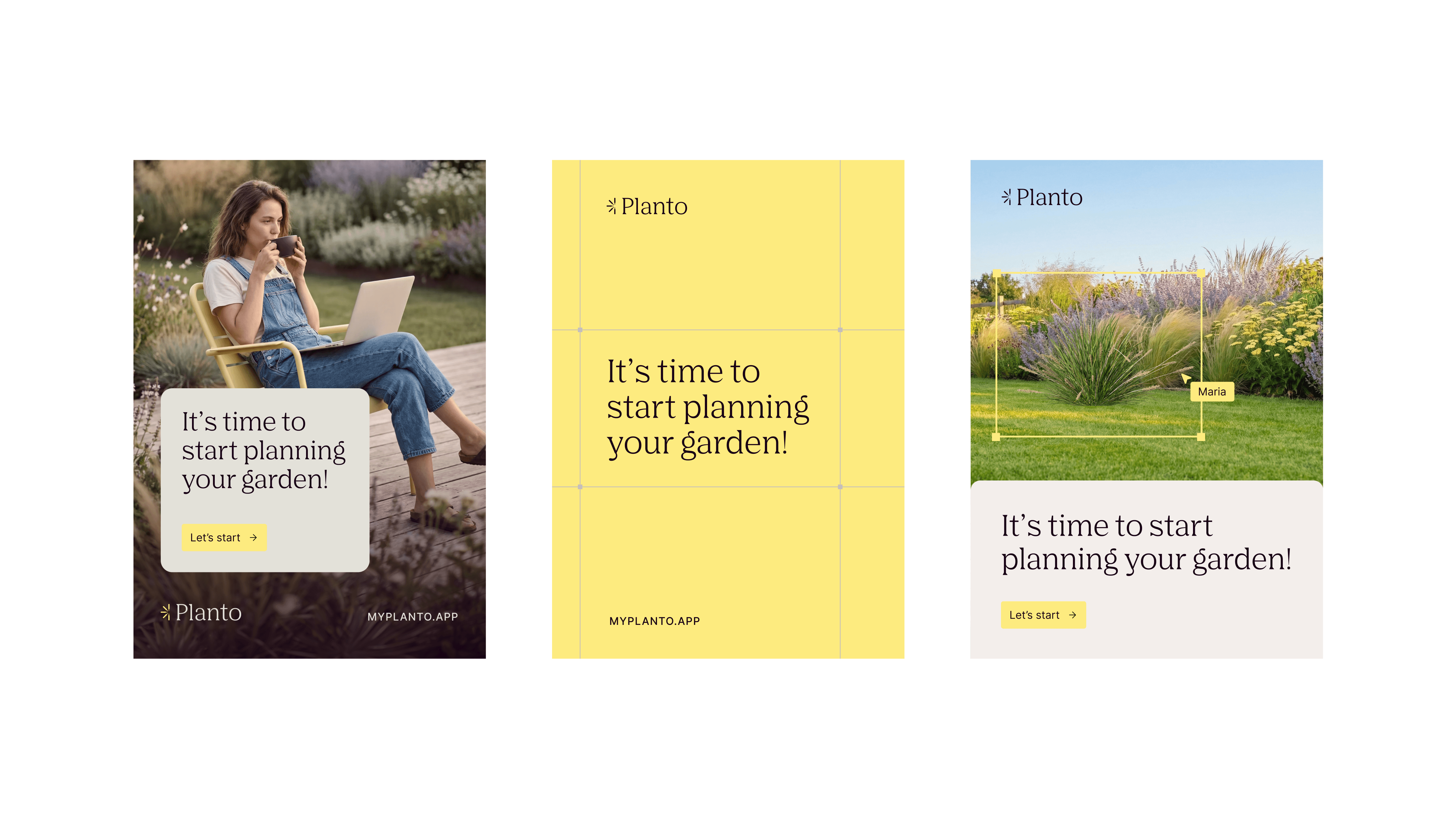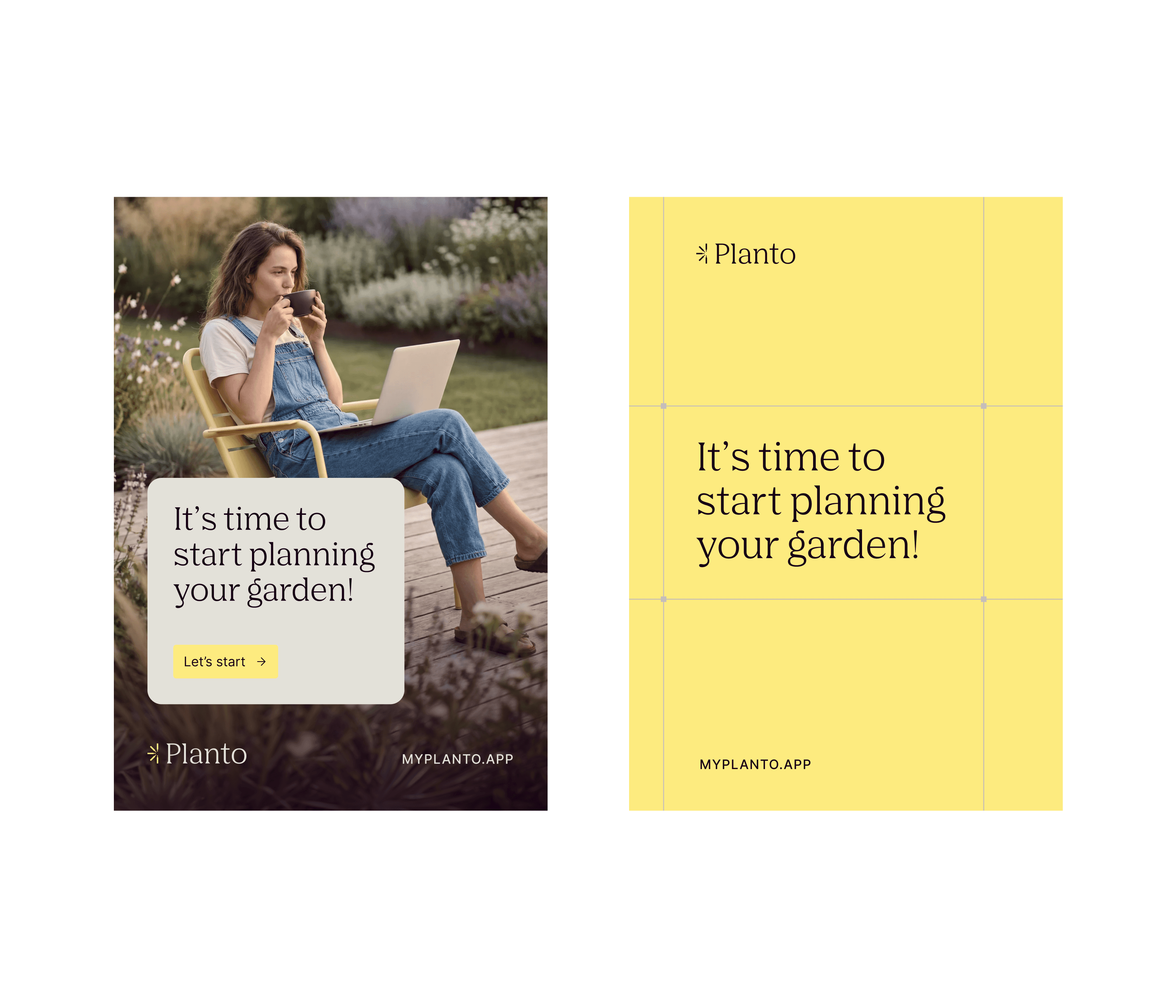 Identita značky odráží atmosféru zahrady při západu slunce. Teplé tóny žluté a elegantní fialová tvoří základ unikátního stylu, který sjednocuje branding i samotné rozhraní aplikace (UI). Celkové pojetí sází na čistotu a přehlednost, aby se kreativita uživatele mohla plně rozvinout.